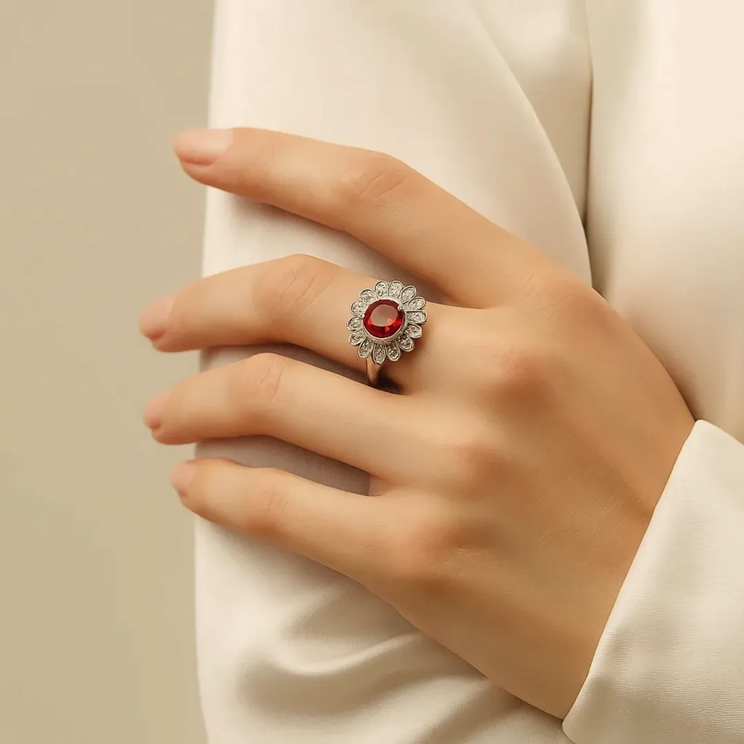 انگشتر نقره ی آبکاری شده نگین قرمز و سبز