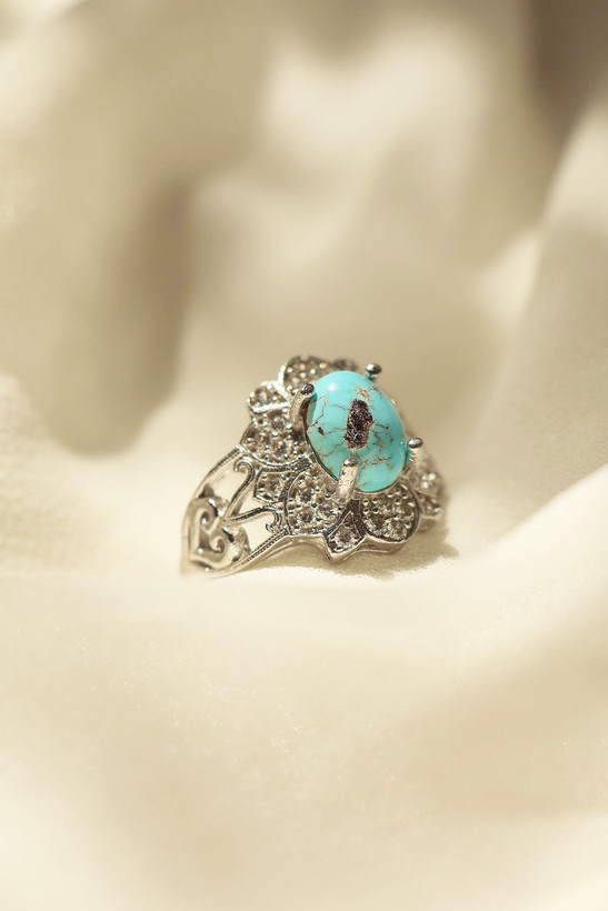 انگشتر زنانه نقره با عیار ۹۲۵ و سنگ فیروزه ی اصل نیشابور ، با آبکاری رادیوم آلمان که رنگ ثابت داره و سیاه نمیشه .. سنگ فیروزه آرامبخش هست برای درمان بیماری های گوارشی برای سر درد و ... مفید هست